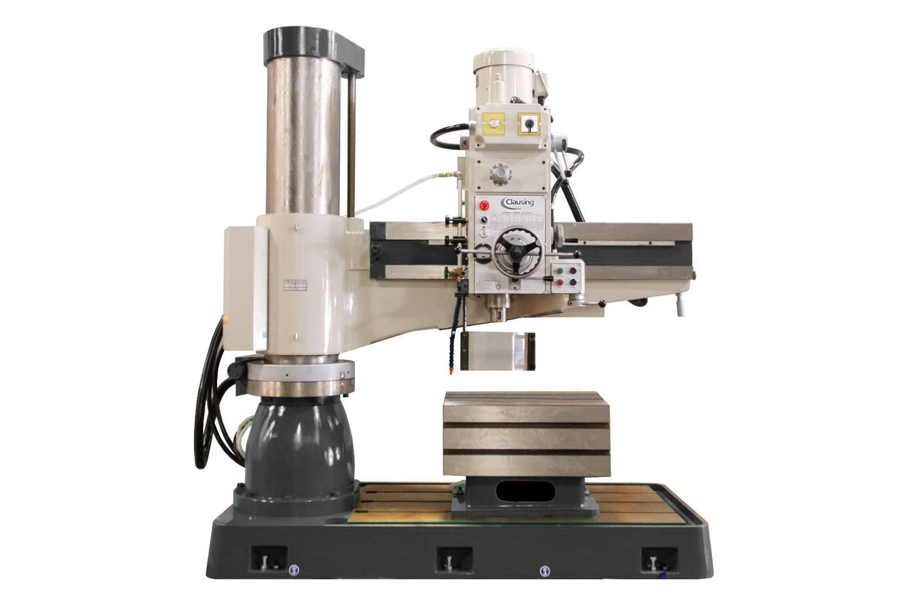 49.2” Arm, 25.1 x 20.4 x 16.5 Box Table, 1.97” Drilling Capacity Steel, 1.57’ Tapping Capacity Steel, 5 Hp 2-Speed Spindle Motor, W/CE Electrics, Spindle Guard, 12 – Speed Geared Head, 56 to 1450 rpm Spindle Speed, Self-Contained Coolant System, 230/460 Volts 3 Phase Available through Commonwealth Industrial—your Clausing sales and service partner.