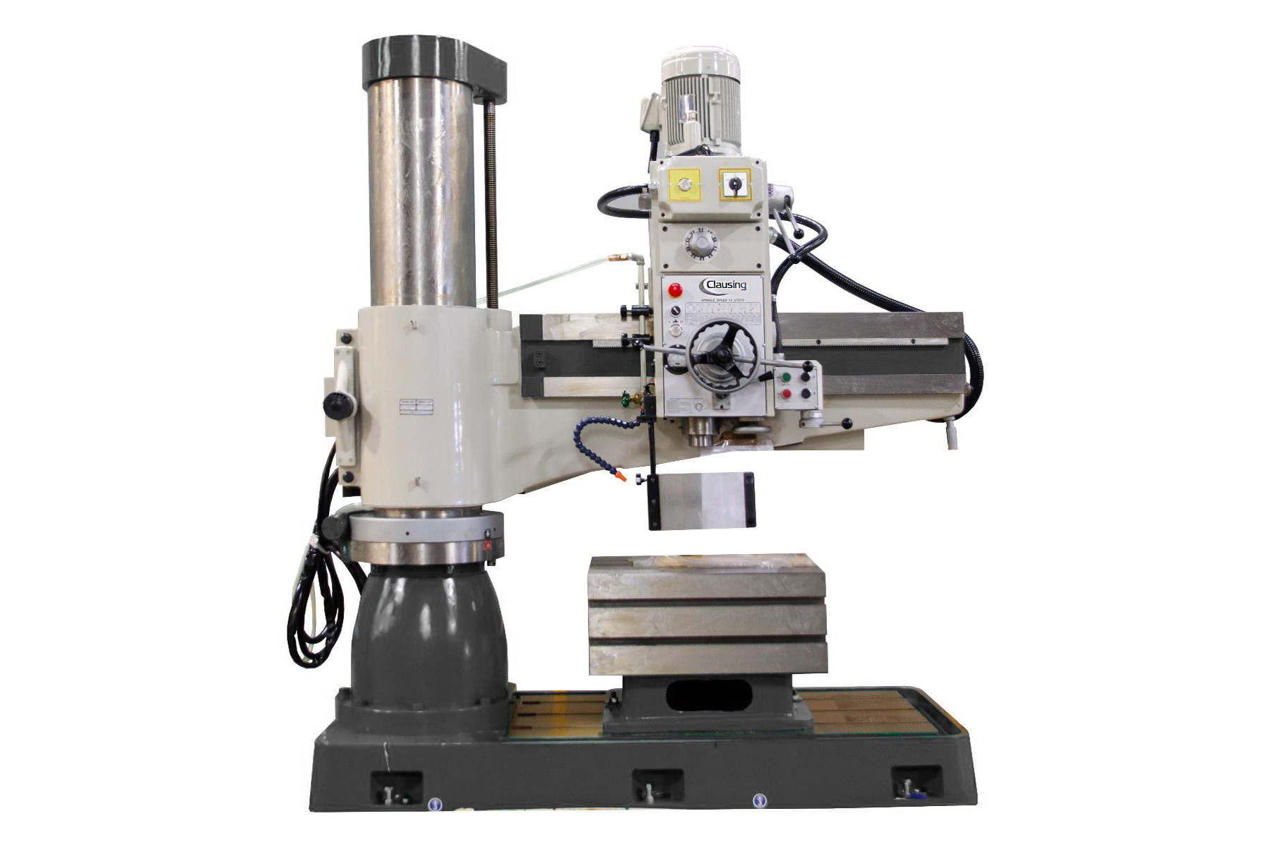 63” Arm, 24.8 x 19.7 x 19.7 Box Table, 1.97” Drilling Capacity Steel, 1.57” Tapping Capacity Steel, 5 Hp Spindle Motor, W/CE Electrics, Spindle Guard, 12 – Speed Geared Head, 56 to 1450 rpm Spindle Speed, Self-Contained Coolant System, 230/460 Volts 3 Phase Available through Commonwealth Industrial—your Clausing sales and service partner.