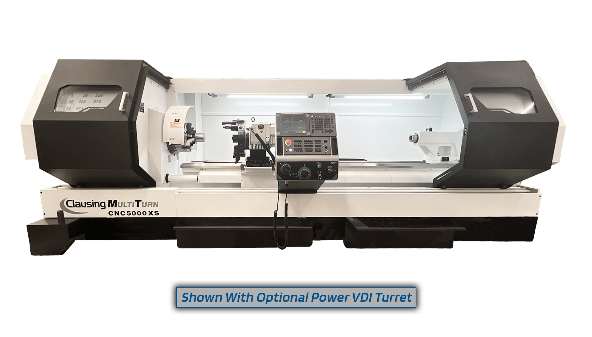 Clausing Colchester/Harrison Multi‑Turn flat‑bed CNC lathe with teach functions. 26″ swing over bed; 3‑gear infinitely variable speed ranges 26–2000 rpm; 25 hp spindle motor; 18.1″ swing over the cross slide; 4.09″ spindle bore; D1‑11 camlock spindle nose; 4.125″ tailstock quill diameter with 6 Morse taper bore. 230/460 volts, 3‑phase. Available through Commonwealth Industrial.